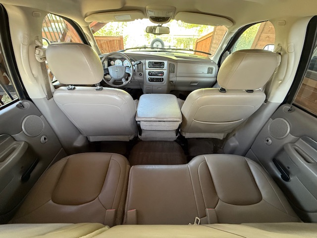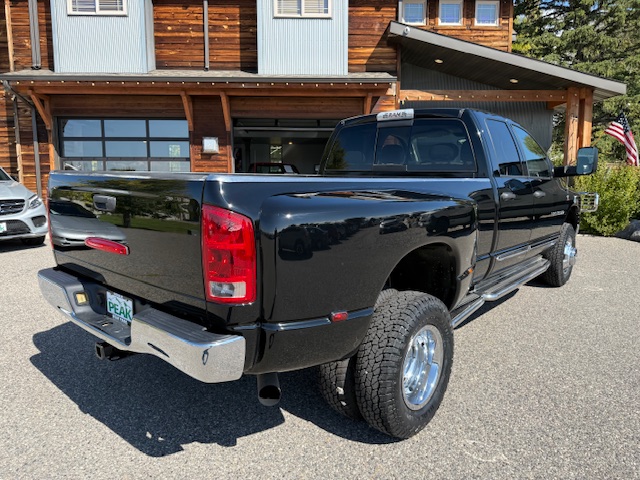 This is a 2004 Dodge Ram 3500 SLT Crew cab dually 4×4 with the 5.9L Cummins turbo diesel engine and an automatic transmission and has 120,000 miles. This Ram is black in color with tan leather interior. It has shift on the floor 4×4 with low-range, keyless entry, power windows, power door locks, air conditioning, cruise control, bed-liner, fog lights, chrome brush guard, heated seats, sliding rear window, tow mirrors, factory CD player, power driver’s seat, factory chrome wheel caps with new Blackhawk Ridgecrawler all-terrain tires, cab-lights, tow package, infiniti stereo and full length chrome running boards. This Ram is from Sulton, Washington that has been well maintained and has been non-smoker owned. CARFAX guaranteed, professionally serviced and detailed.