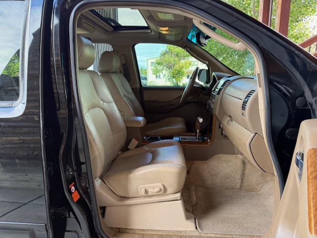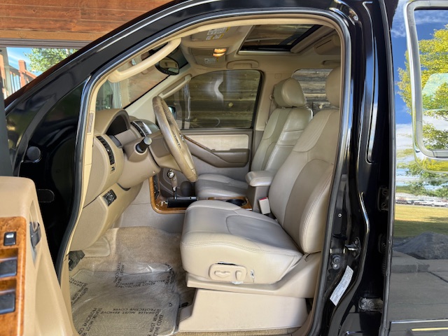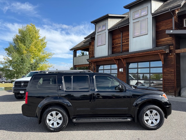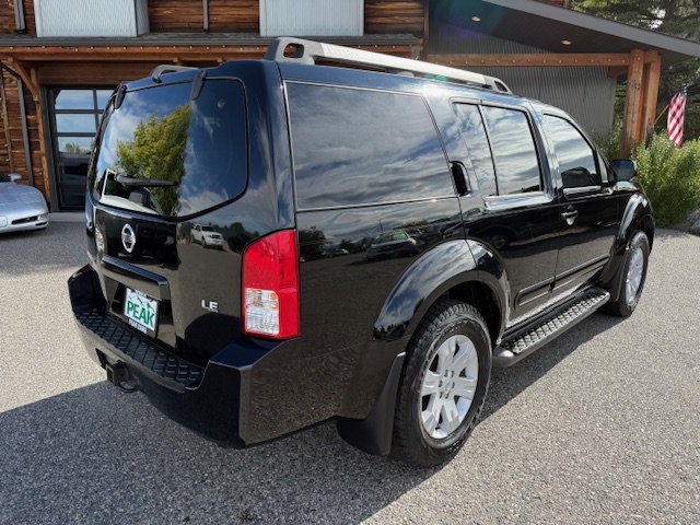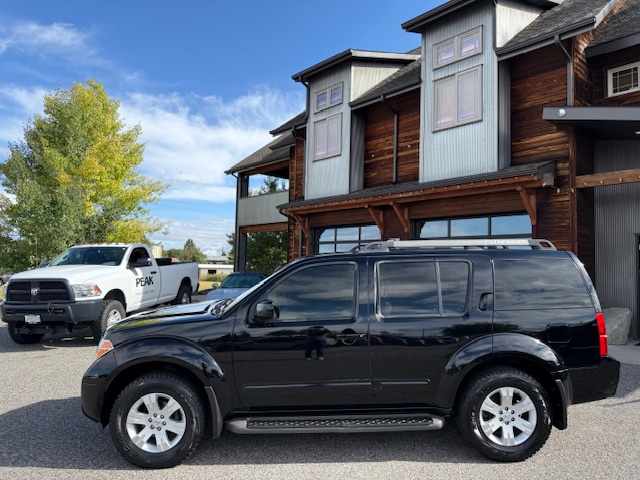 This is a 2005 Nissan Pathfinder LE 4×4 with the 4.0L 266-hp DOHC 6-cylinder gas engine and a 5-speed automatic transmission. It is black with tan leather interior and has 182,000 miles. This Pathfinder has all power options shiftable 4×4, heated seats, power moonroof, BOSE factory audio system with CD player, 17-inch alloy wheels with nice Bridgestone Blizzak DMV-2 tires, fog lights, roof rack, Class III tow package, and running boards. It is EPA rated at 14 mpg city and 20 mpg highway. This Pathfinder is a nice clean 2-owner from Bozeman that has been well maintained and has been non-smoker owned. CARFAX guaranteed, professionally serviced and detailed.