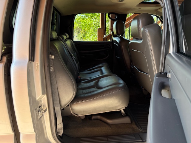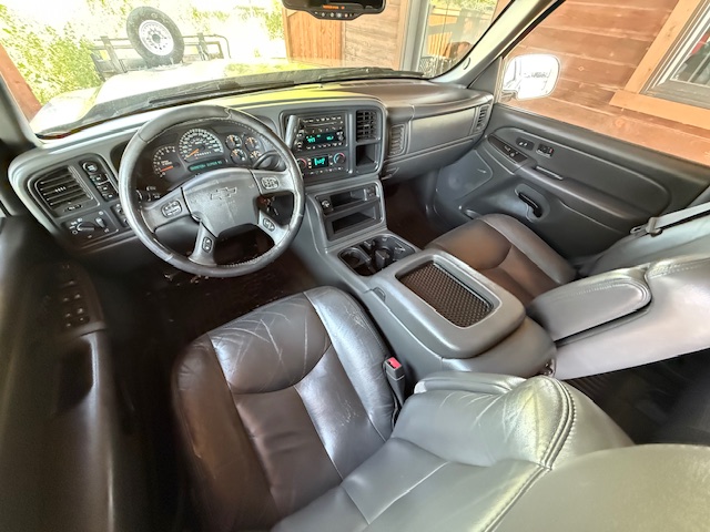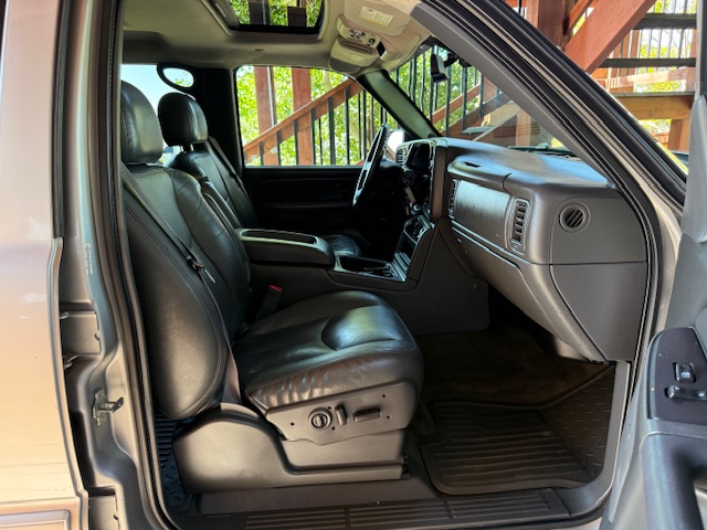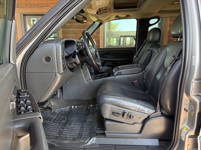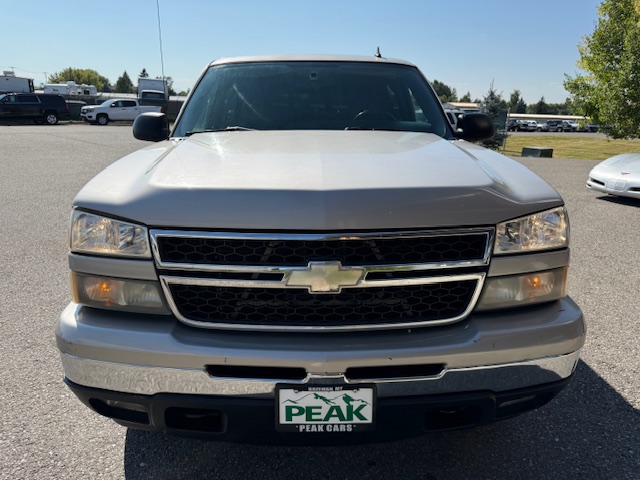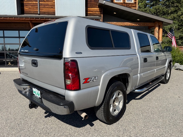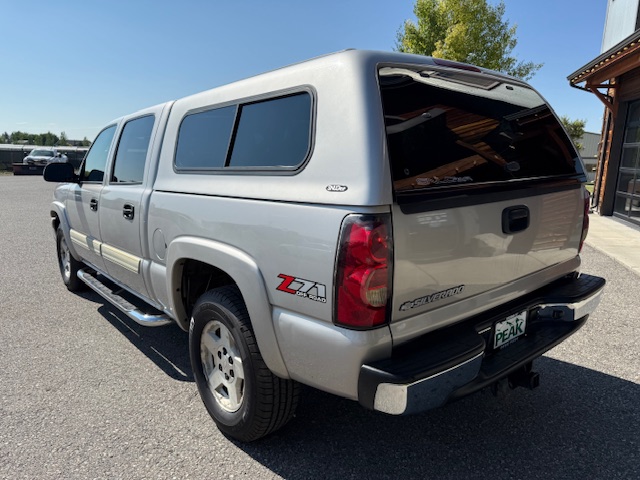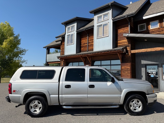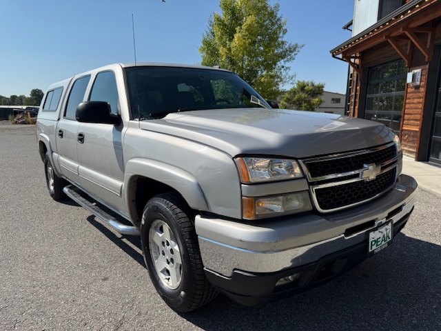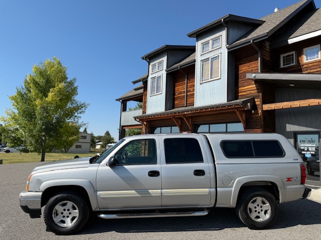 This is a 2006 Chevrolet Silverado 1500 half-ton LT crew cab 1500 4×4 with the 5.3L Vortec 8-cylinder gas engine and an automatic transmission. It has 217,000 miles. It is Silver Birch with dark gray leather interior. It has heated seats, BOSE factory BOSE CD player, fiberglass SnugTop topper, power windows, power locks, power driver’s seat, cruise control, air-conditioning, 5.5ft rhino-lined bed, nerf bar running boards, Class III tow package and rear tinted windows. It has a nearly new set of Michelin all-season tires and all new ball joints. Alot of recent maintenance. This Silverado is from Montana and has been non-smoker owned and well maintained. CARFAX guaranteed, professionally serviced and detailed.