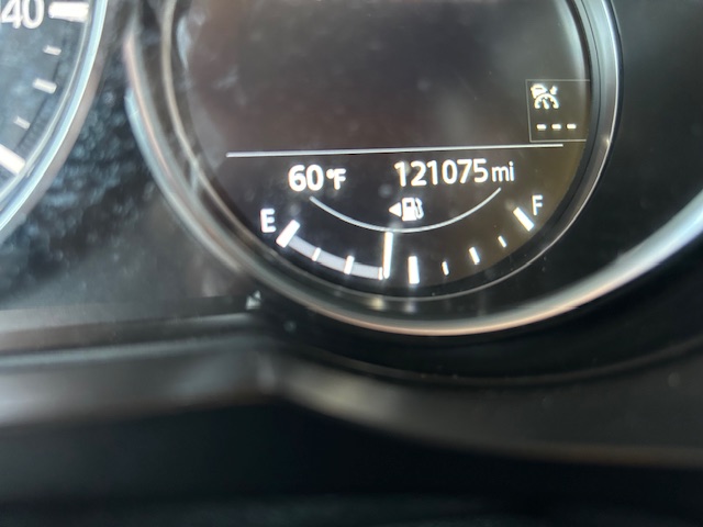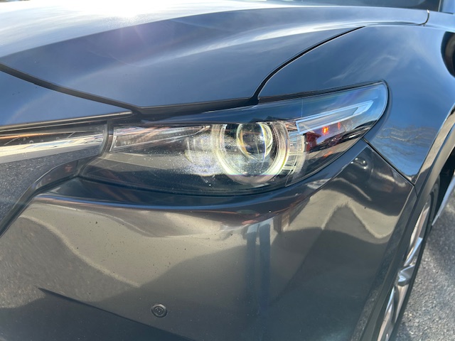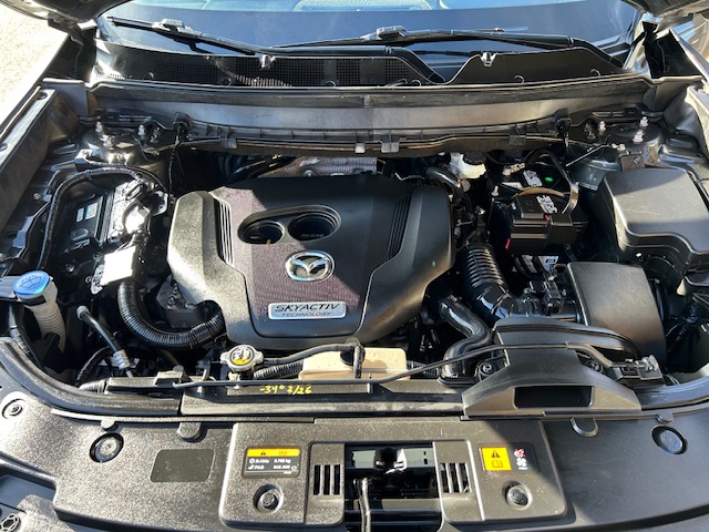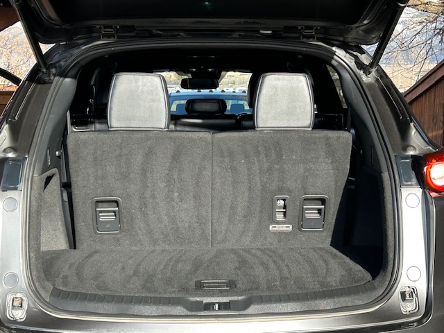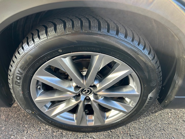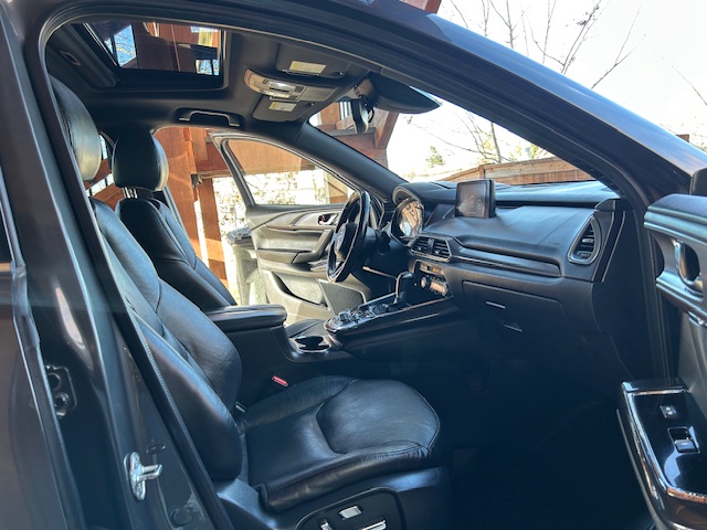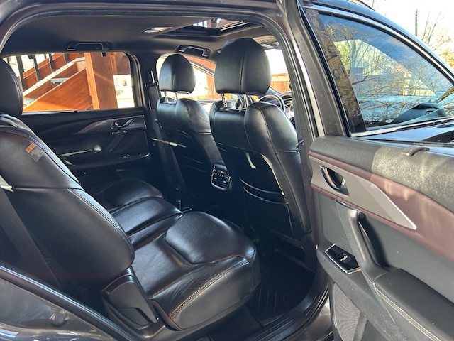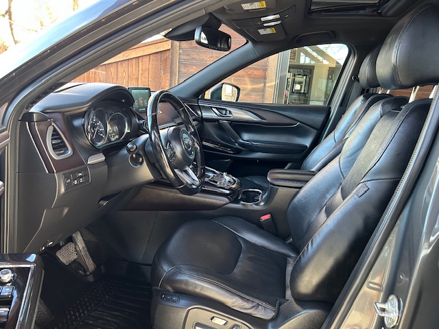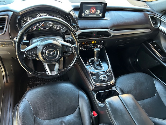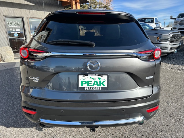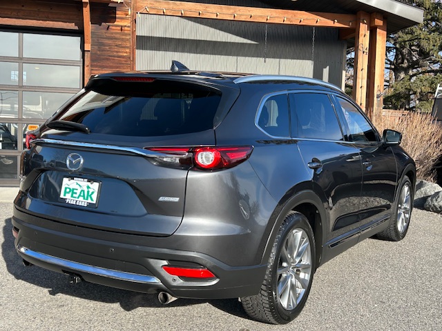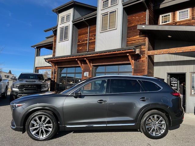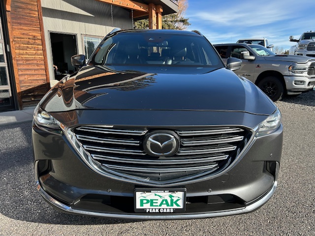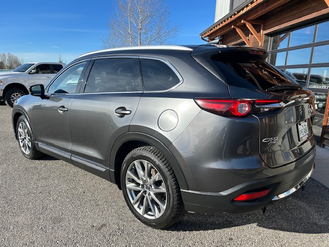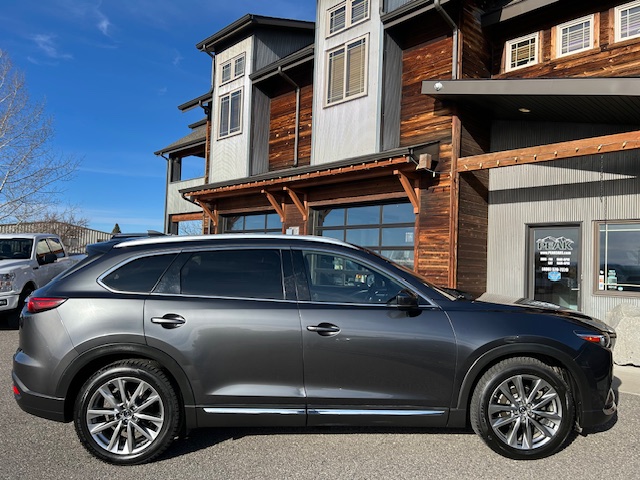 This is a 2018 Mazda CX-9 Grand Touring with the 250hp 2.5L 4-cylinder gas engine and an automatic transmission. It is Machine Gray Metallic with black leather interior. It has 120,000 miles. This is a local trade-in from Bozeman. The Grand Touring model has heated leather seats, heated steering wheel, 9-speaker BOSE stereo with 8-inch touch-screen, moonroof, USB ports, automatic high beams, lane-departure warning, and automatic climate control. It has 17-inch argent gray wheels with nearly new snow-rated tires, LED headlights, keyless entry, all power options, 3rd row seat, and bluetooth. The second and third row seats fold flat and a 5 star overall safety rating from NHTSA. This CX-9 is rated for 20 mpg city and 26 mpg highway.