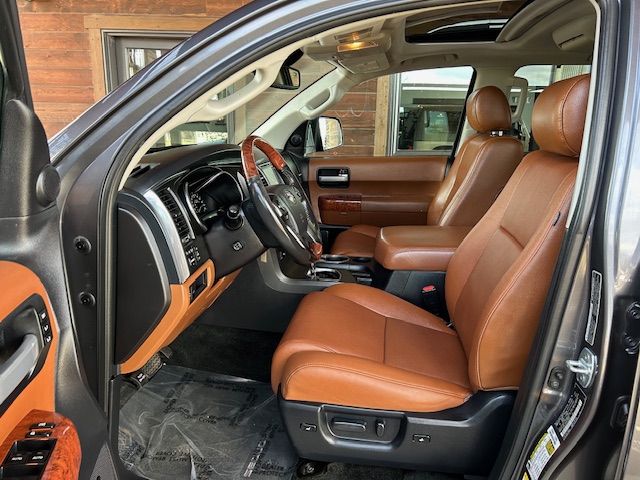 This is a 2018 Toyota Sequoia Platinum 4×4 with the big 381HP 5.7L 8-cylinder engine and a 6-speed automatic transmission. It is Magnetic Gray Metallic with brown perforated leather interior. It has 112,000 miles. This Sequoia has quad bucket seating, heated & cooled front leather seats, heated rear bucket seats with console, navigation, power rear sliding window, rear entertainment/TV, power third row seats, roof rack, JBL Synthesis stereo/CD, power glass moonroof, BSM (Blind Spot Monitor) Class III tow package, fog lights, Sport/Comfort suspension settings, adjustable height rear suspension, 20-inch factory aluminum wheels with nice Goodyear Eagle Sport tires, privacy glass, roof rack, running boards, fog lights, and all power options. This Sequoia is a 2-owner from Glendale, California that has been well maintained and has been non smoker owned. CARFAX guaranteed, professionally serviced and detailed.