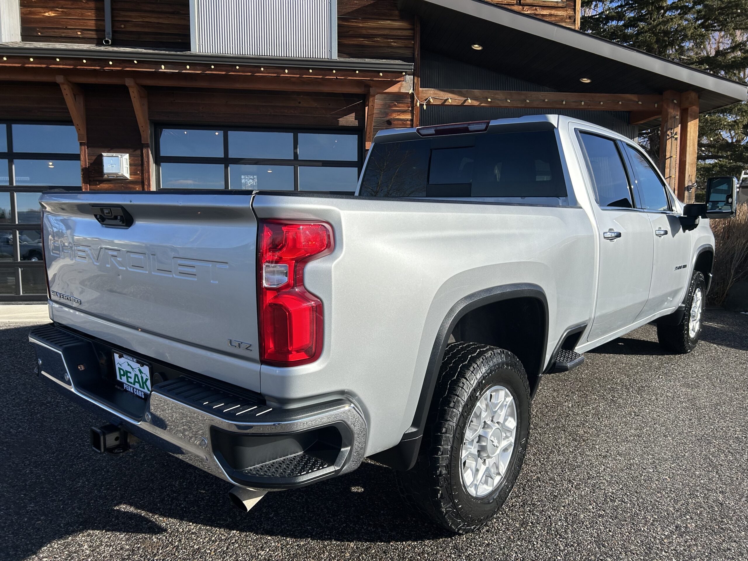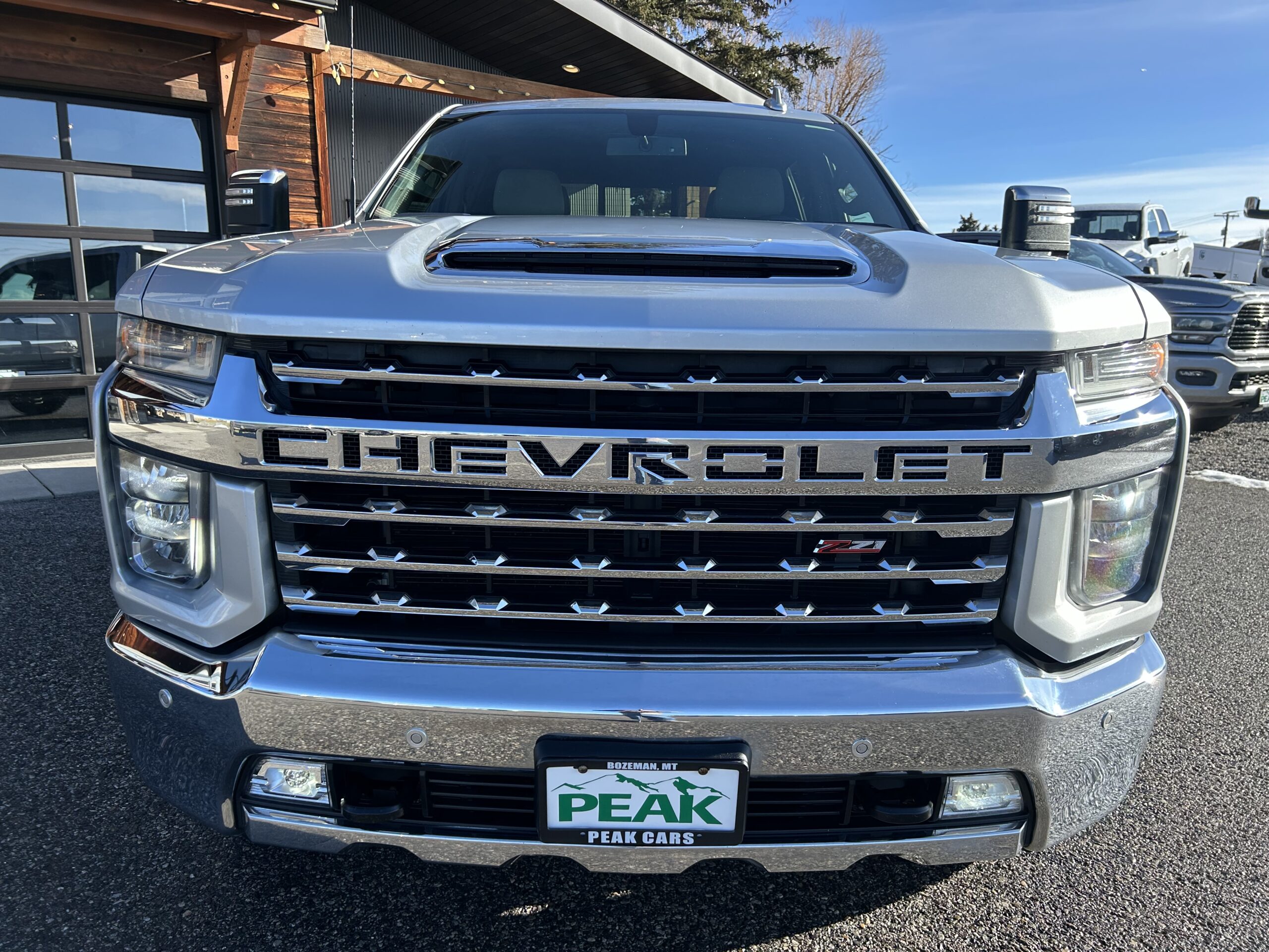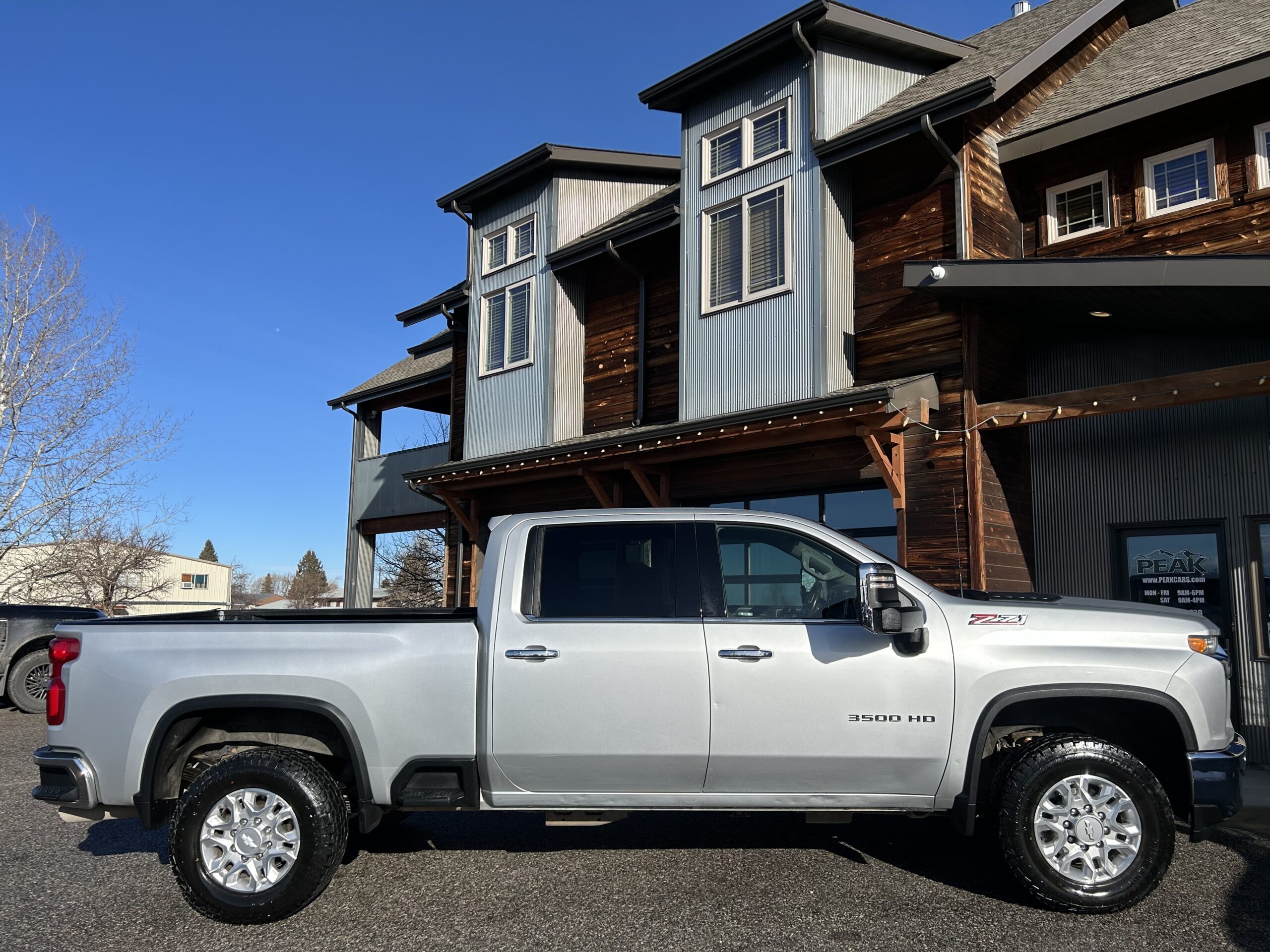 This is a 2020 Chevrolet Silverado 3500HD Crew-Cab short box LTZ 4×4 pickup with the 6.6L 8-cylinder gas engine and a 6-speed automatic transmission. It is Silver Ice Metallic in color with Gideon/Very Dark leather interior and has 177,000 miles. It has the 8″ factory touchscreen/CD player, heated/cooled seats, heated steering wheel, rear sliding power window, heated rear seats, Z71 Off-Road package, bluetooth AUX/USB, backup camera, skid plates, trailering mirrors, remote start, keyless entry, cruise control, factory spray-in bedliner, front bucket seats with console, integrated trailer brake controller, 3.73 axle ratio, 18-inch factory wheels with nice Vredstein all-terrain tires and factory tow package. This Silverado is a one-owner Bozeman truck that has been well maintained and has been non-smoker owned. CARFAX guaranteed, professionally serviced and detailed.